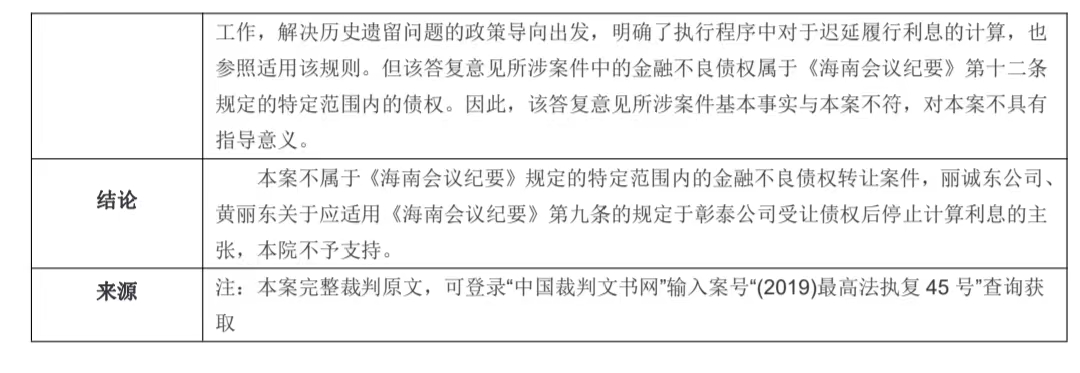 第三,本期案例中,债权最初的转让时间(2014 年 4 月 25 日)和转让主体(兴业信托公司) 与《海南会议纪要》第十二条的规定不符,故不应适用《海南会议纪要》关于自受让日后停止计付 利息的规定。 综上,一般金融不良债权转让案件并不参照适用该《海南会议纪要》,受让人基于一般不良债权有权向债务人主张自受让之日后的利息。