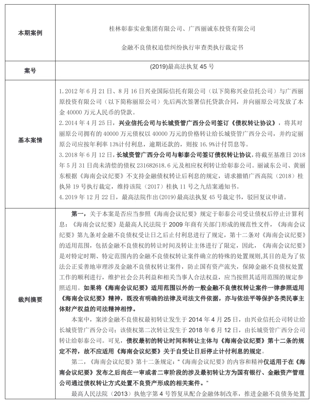 第一,《最高人民法院关于审理涉及金融不良债权转让案件工作座谈会纪要》(以下简称“《海 南会议纪要》”)是最高人民法院于 2009 年商有关部门形成的规范性文件,是对特定时期、范围内 的金融不良债权转让案件确立的特殊的处置规则;