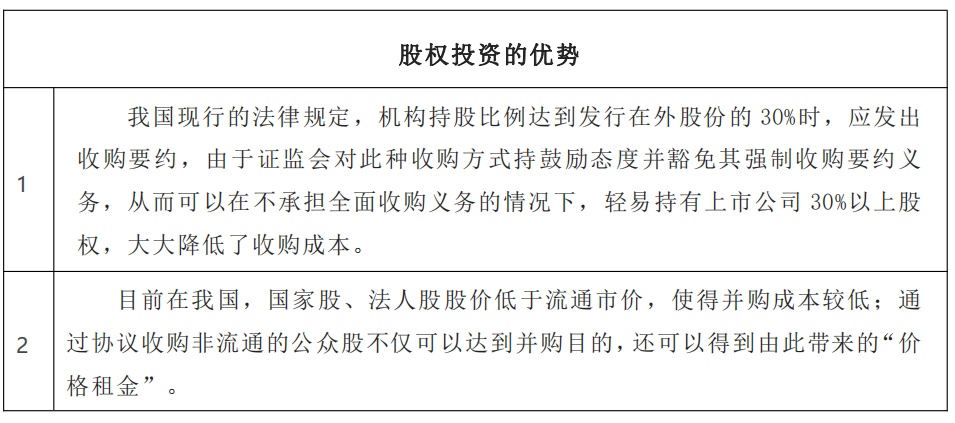 股权投资是指投资方通过投资拥有被投资方的股权,投资方成为被投资方的股东, 按所持股份比例享有权益并承担相应责任与风险。常见股权投资方式如下: