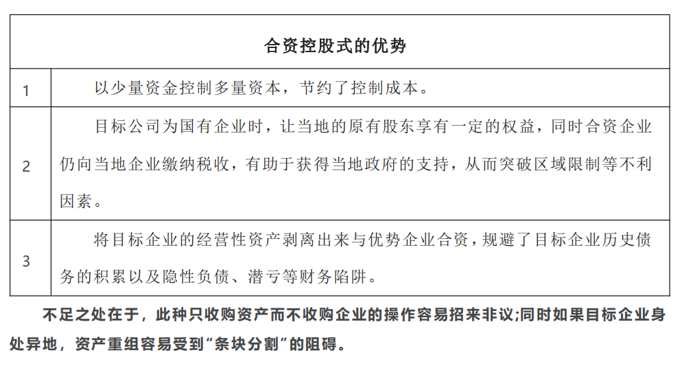 【实例】青岛海信现金出资 1500 万元和 1360 万元,加上技术和管理等无形资产, 分别同淄博电视机厂和贵州华日电器公司成立合资企业,控股 51%,对无力清偿海 信债务的山东电讯器材厂和肥城电视机厂,海信分别将其 393.3 万元和 640 万元债权转为股权,加上设备、仪表及无形资产投入,控股 55%,同他们成立合资企业, 青岛海信通过合资方式获得了对合资企业的控制权,达到了兼并的目的。